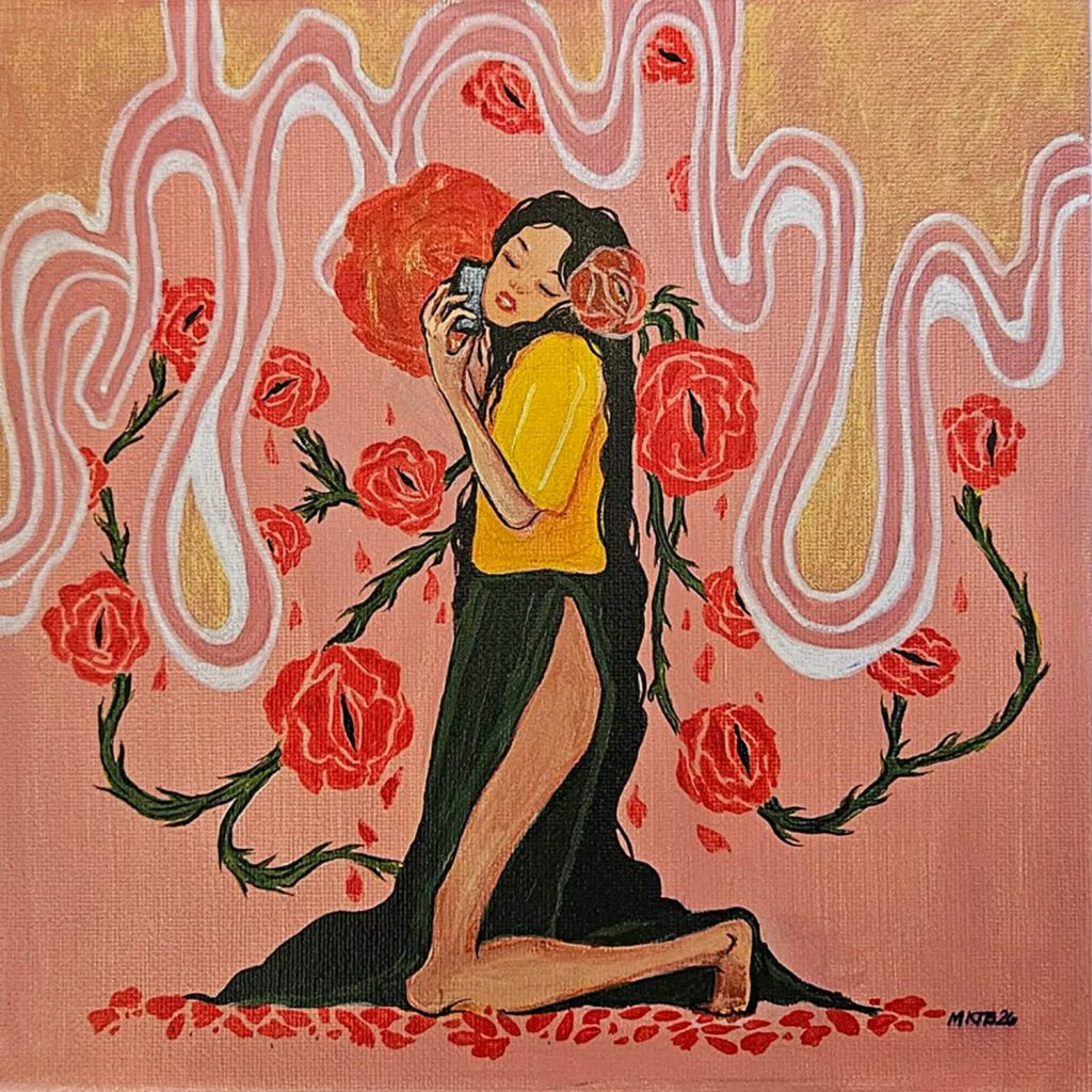 Exploring a woman’s unguarded moments, sensuality and candor, Katz Tecson Baynosa’s paintings of Filipiniana-attired women holding mobile phones while in varying provocative poses show us just how much society has evolved and emancipated women.
